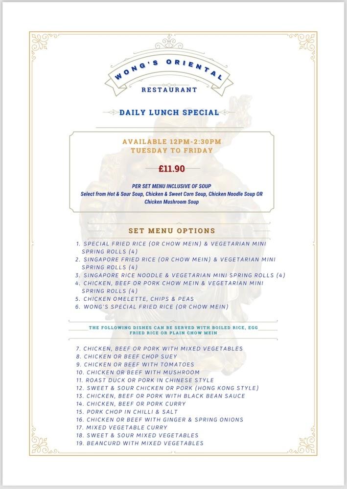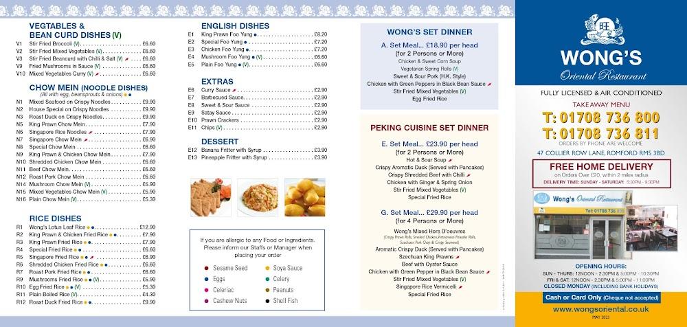 Located conveniently at 47 Collier Row Ln, Romford RM5 3BD, Wong's Oriental Restaurant is a local gem that showcases authentic Chinese cooking. The establishment prides itself on its warm and inviting ambiance, designed for comfort and relaxation. With a full air conditioning system, diners can enjoy their meals in a pleasant environment no matter the weather outside. The restaurant is spacious enough to accommodate large groups while also remaining intimate for smaller parties. This flexibility makes it an ideal spot for various occasions, from family dinners to celebratory gatherings. Service is paramount here; the dedicated staff ensures a welcoming atmosphere, always greeted with a smile. Park your worries at the door, for Wong's takes pride in catering to both dine-in and takeout customers, ensuring exceptional quality and taste in every bite.